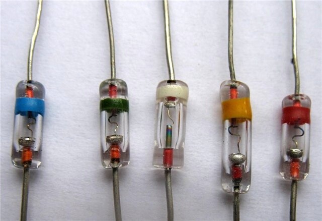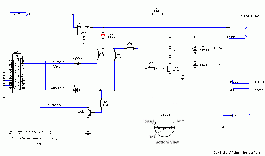 присланные мне на Простой программатор ("железо") для PIC18F14K50![]() Примечания: 1) Контроллер pic18f14k50 требует напряжений не выше Vusb + 0.3 В, т.е., около 3.6 В, на выводах D+/D-, используемых при программировании. Для обеспечения этого требования в схеме усталовлен светодиод LED1, "съедающий" 1.8 В от питающих 5 В, поэтому исключать LED1 из схемы или же заменять его обычным диодом НЕЛЬЗЯ. 2) Диоды D1 и D2 должны быть германивые, а НЕ кремневые (у германиевых падение напряжения в прямом направлении около 0.2 В, а у кремниевых - около 0.6 В), иначе схема не будет работать или будет работать нестабильно. Вот как выглядит самый "популярный" германиевый диод 1N34 ![]() и его советский брат-близнец Д9 ![]() 3) Еще одна особенность pic18f14k50 - узкие рамки для напряжения на выводе Vpp: 8.5...9.0 В в режиме "высоковольтного" (high-voltage) программирования. В этой схеме это напряжение формируется парой стабилитронов D4-D5. 4) Вывод Vdd контроллера "намертво" подключен к +5 В, что допустимо согласно спецификации программирования, хотя в более "крутых" программматорах, как правило, имеется отдельный ключ, позволяющий управлять напряжением на выводе Vdd из программы. Внешний вид готового устройства: ![]() Коментарии: 1) USB-разъем попал сюда потому, что у pic18f14k50 выводы для программирования совмещены с выводами D+/D- USB приемопередатчика. Поэтому очень удобно подключать контроллер к программатору при помощи стандартного USB-кабеля. "Неумещающаяся" в 4 проводах USB-кабеля линия Vpp выведена на отдельный провод, оканчивающийся разъемом под соответствующий одинокий "штыри" на плате с контроллером. 2) Монтаж выполнен из двух "блоков" - часть элементов напаяна прямо на выводы разъема LPT, а остальная часть смонтирована на компактной макетной плате рядом с USB-разъемом. (13.08.2012) Простой программатор (СОФТ) для PIC18F14K50(описание + исходник на Delphi 6.0): Скачать(24.06.2012) Простейший пример USB-устройства на PIC18F14K50(исходник для MikroC): Скачать(08.07.2012)
